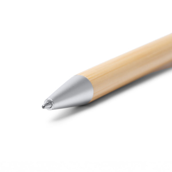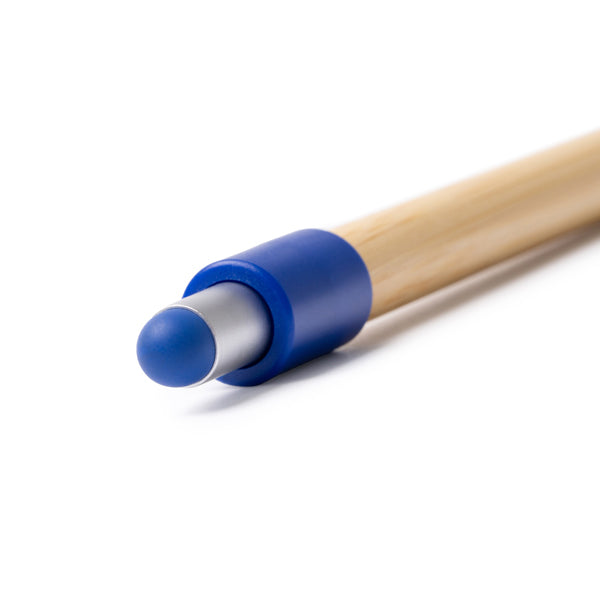 Bolígrafo multifunción con diseño giratorio tipo spinner antiestrés. Cuerpo de bambú natural y puntero táctil, realzados con detalles metálicos en acabado mate. Equipado con carga jumbo de tinta azul para una escritura fluida y duradera.