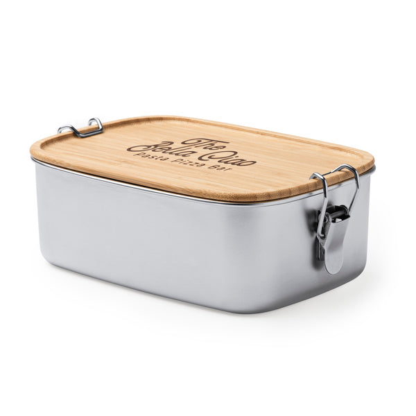 Fiambrera de acero inoxidable 304 con tapa de bambú, que combina resistencia y un diseño natural y elegante. Su sistema de cierre con hebillas laterales asegura un sellado firme, manteniendo los alimentos en perfecto estado.