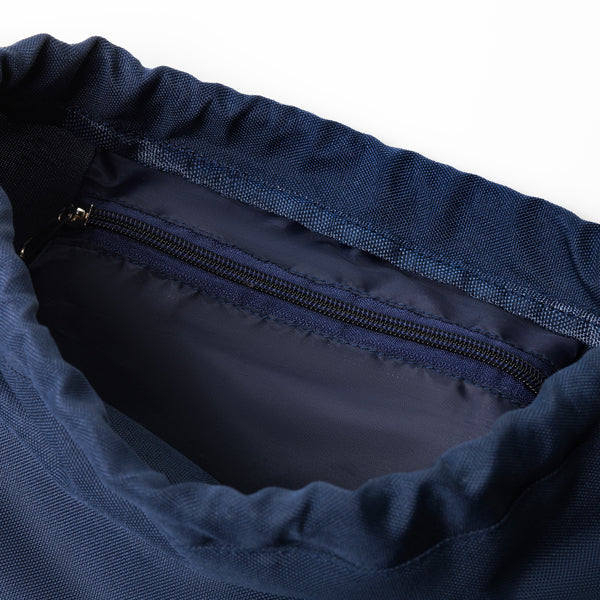 Mochila deportiva de diseño plano, ideal para personalizar. Fabricada en 100% poliéster 600D de 150 g/m², cuenta con cordones planos a tono y práctico bolsillo interior con cremallera para guardar objetos de forma segura.